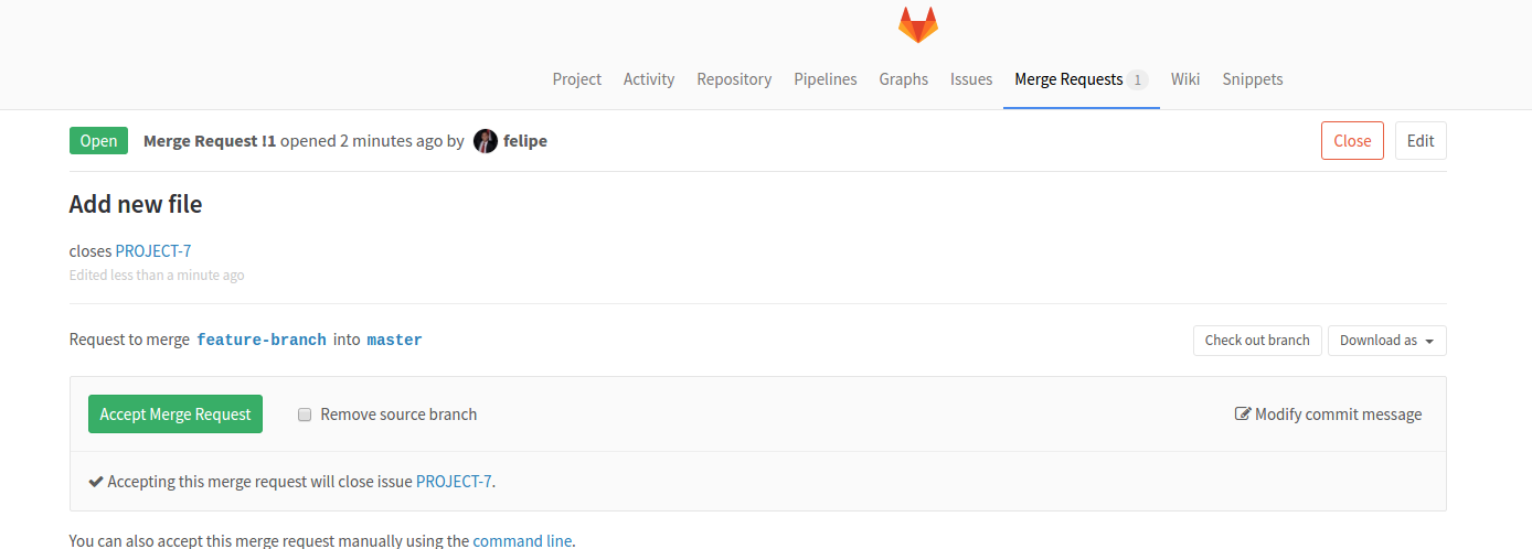 Closes PROJECT-7. - Once the merge request is merged, the JIRA issue will be automatically closed with a comment and an associated link to the commit that resolved the issue.