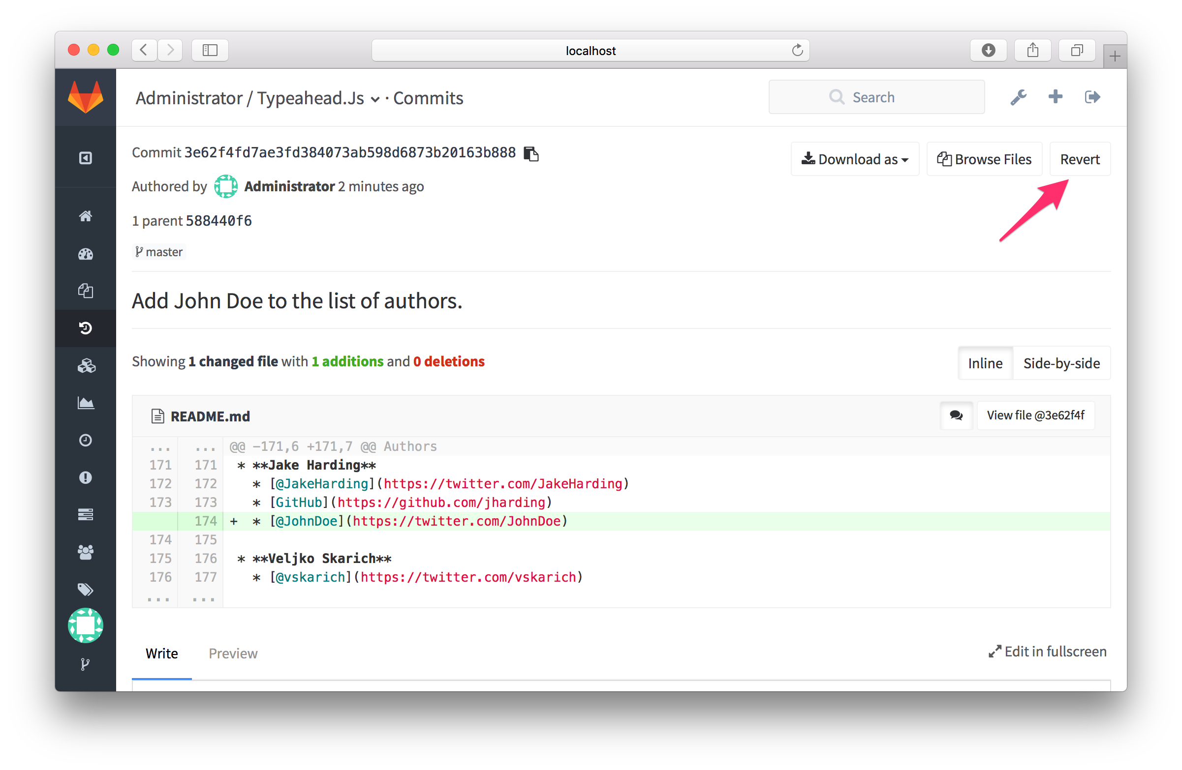 GitLab implements Git's powerful feature to revert any commit with introducing a Revert button in Merge Requests and commit details.